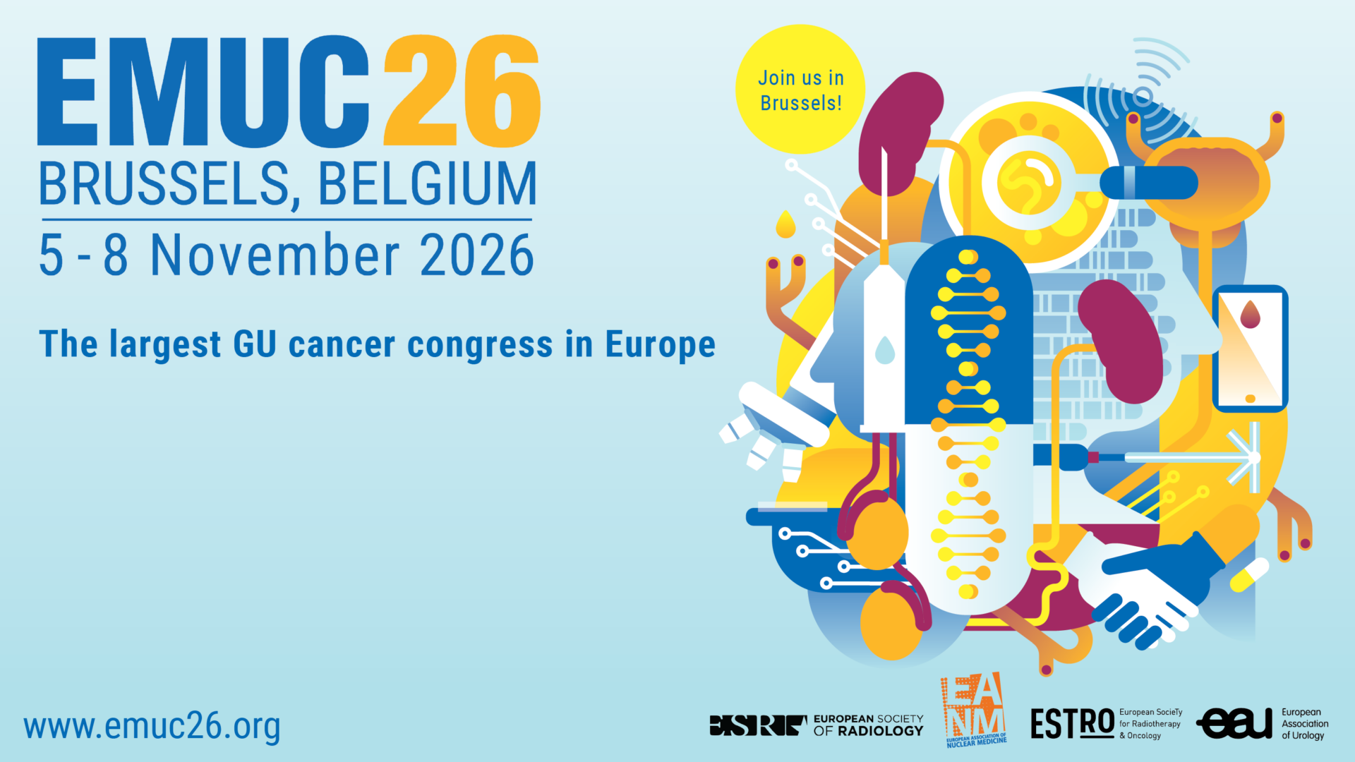 EMUC26 will take place on November 5-8, 2026, in Brussels, Belgium, and is jointly organised by the European Association of Urology (EAU), European Society of Radiology (ESR), European Society for Radiotherapy and Oncology (ESTRO), and EANM.
